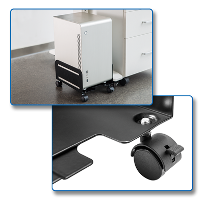 This rolling caddy features four swivel casters that roll smoothly in any direction, allowing you to place your computer where you need it and reposition it to access cables and ports. Two of the casters lock securely to keep your computer firmly in place, so you don’t have to worry about it moving around.