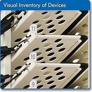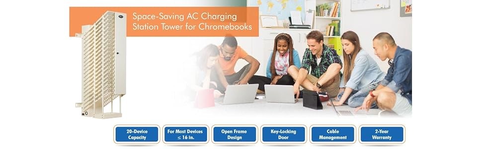 The front door locks to deter theft of devices without interrupting sight lines. Once the tower is secured against a wall, the outlets and power adapter shelves can only be accessed through the top panel.