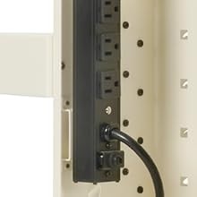 Adjustable shelves in the rear compartment hold device power adapters. When populating the tower, start at the bottom and work up, leaving any unused outlets and shelves near the top of the tower.