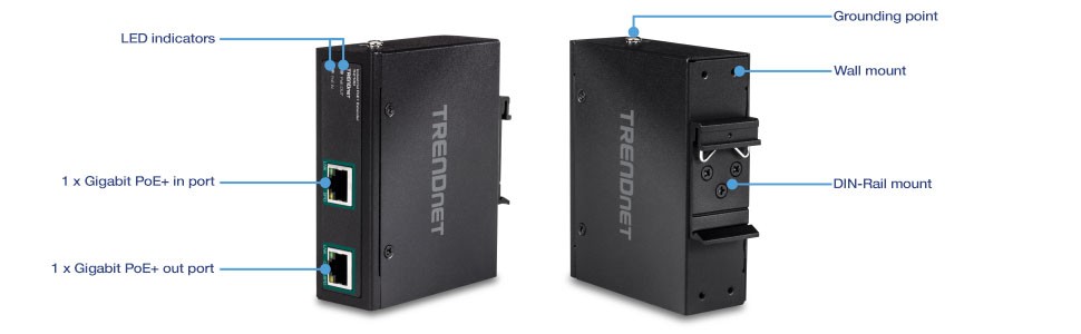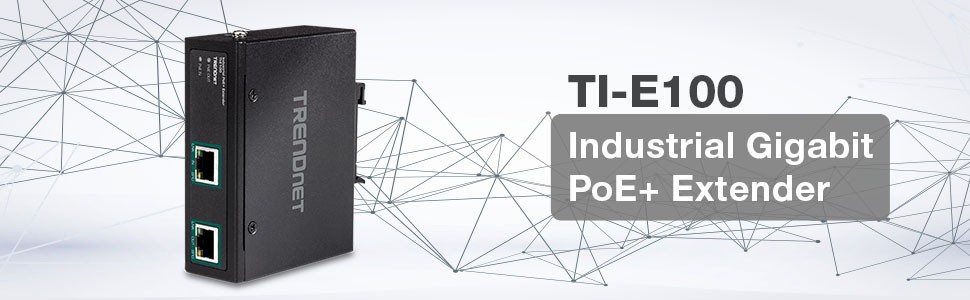 TRENDnet's Industrial Gigabit PoE+ Extender, model TI-E100, takes a single PoE+ connection and extends it an additional 100m (328 ft.) for remote PoE/PoE+ device installation. The industrial PoE+ extender auto-detects a PoE or PoE+ connection, and then extends it for a total distance of up to 200m (656 ft.) from the PoE+ power source equipment. The TI-E100 industrial PoE+ extender features a convenient wall mountable design for installation flexibility. Daisy-chain up to two industrial PoE+ extenders for a total PoE+ network extension of 300m (984 ft.).