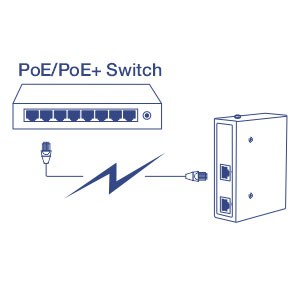 The industrial PoE+ extender features one gigabit PoE+ input port and one gigabit PoE+ output port