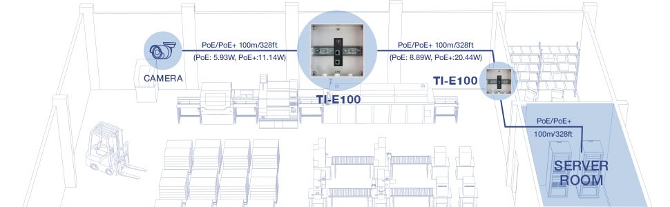 Connect up to two TI-E100 industrial PoE+ extenders for a total PoE+ network extension of up to 300m (984 ft.)