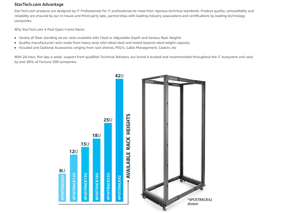 StarTech.com 15U 19" Open Frame Server Rack - 4 Post, Adjustable Depth 22 to 40" - Mobile Network Equipment Rack - HP ProLiant ThinkServer