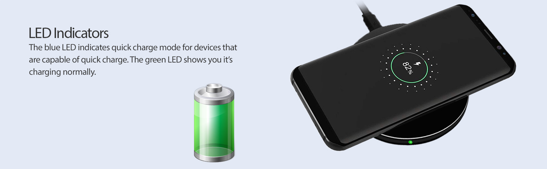 The blue LED indicates quick charge mode for devices that are capable of quick charge. The green LED shows you it’s charging normally.