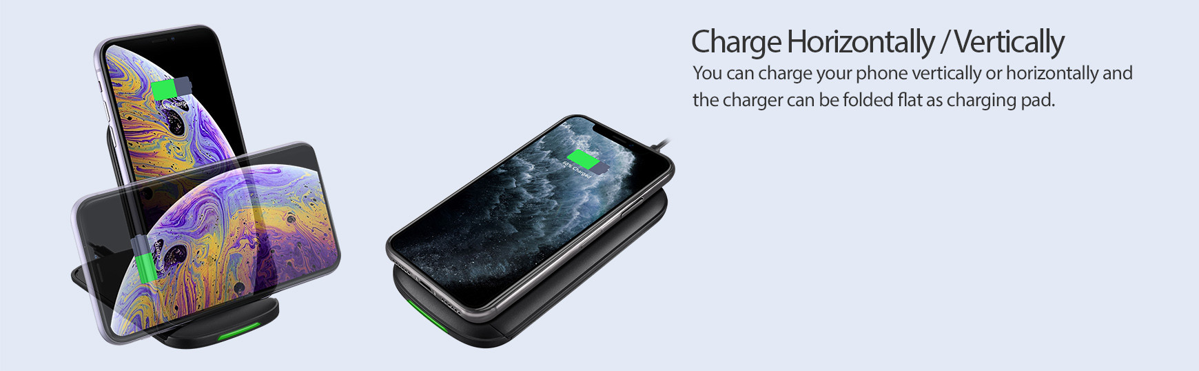 You can charge your phone vertically or horizontally and the charger can be folded flat as charging pad.