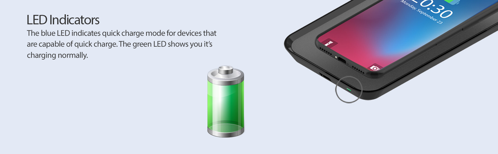 The blue LED indicates quick charge mode for devices that are capable of quick charge. The green LED shows you it’s charging normally.