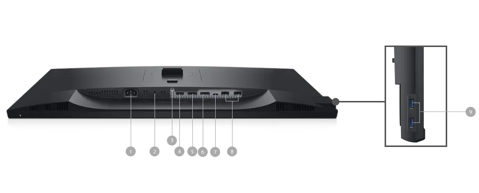1. Power connector | 2.Security-lock slot | 3. Stand lock feature | 4. HDMI 1.4 port | 5.DisplayPort 1.2 (in) | 6. DisplayPort 1.2 (out) | 7. USB-C port | 8.USB 2.0 downstream ports (X2 - rear) | 9. USB 3.0 downstream ports(x2 – side)