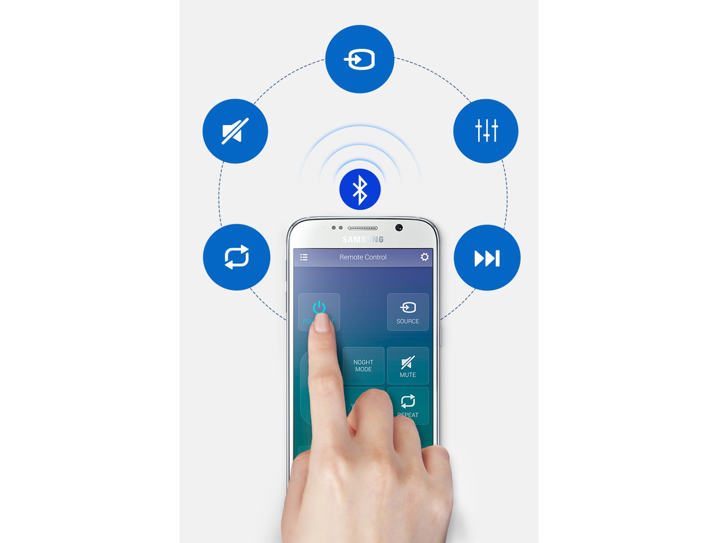 Control your Soundbar with the Samsung Audio Remote App on your smartphone or tablet running on Android™ operating system. Simply connect using Bluetooth™ to control all your key Soundbar functions and play your favorite song lists on your mobile device through one single app.