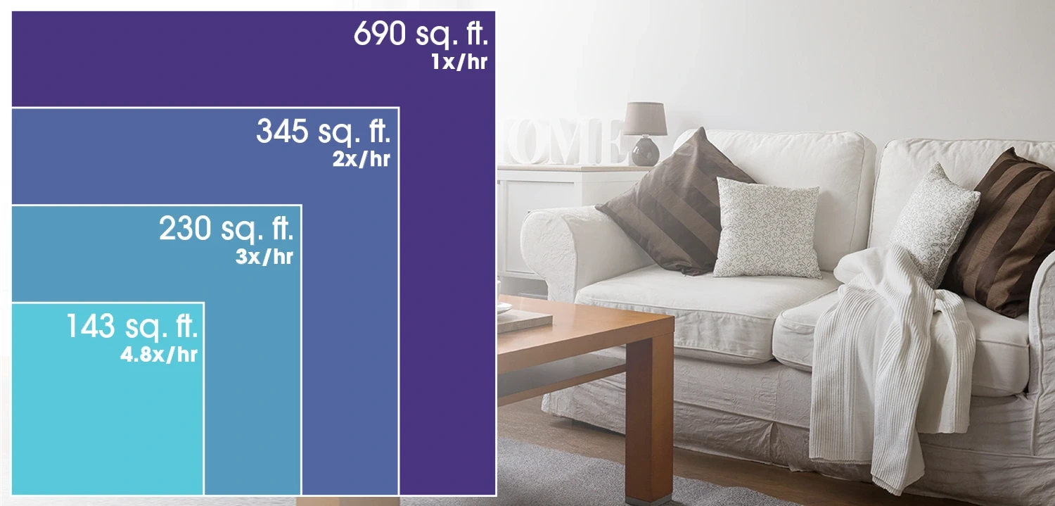 Effective up to 690 sq. ft. at one air change per hour, the FPF30UH will filter the air in the AHAM Suggested Room Size of 143 sq. ft. at 4.8 air changes per hour
