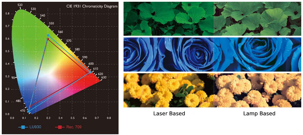 LU930’s powerful laser projection utilizes a dual color wheel system to produce unparalleled color performance that achieves a 92% Rec.709 color coverage. By increasing color ratios and the purity of RGBY color, LU930 dramatically enhances color saturation to ensure superior presentation quality.