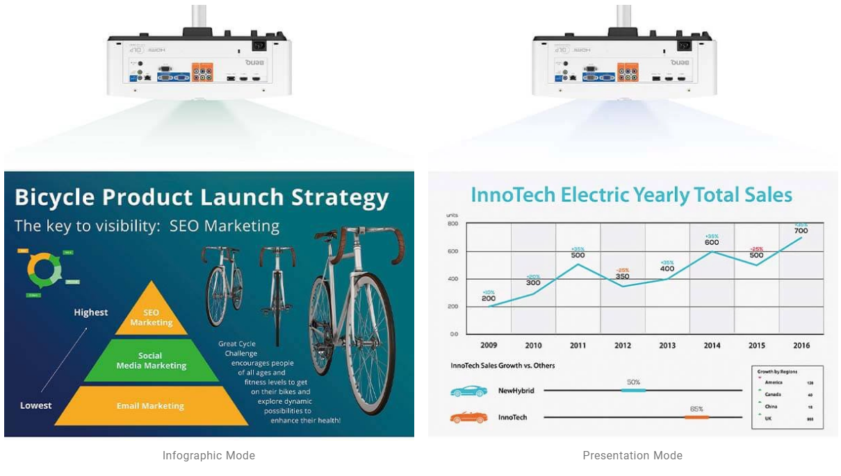 BenQ Infographic Mode perfectly fits the current corporate trend of mastering infographic-heavy presentations that all modern enterprises are striving for. Infographic Mode is great for showcasing the text and graphics of infographic in detail due to LU930’s high brightness and better color gradation through the 92% Rec.709 color coverage, ensuring more saturated and lively color performance than presentation mode. Additionally, Video Mode, with BenQ enhancement technology, is designed for preseving dynamic color details when playing videos in meeting room with ambient light.