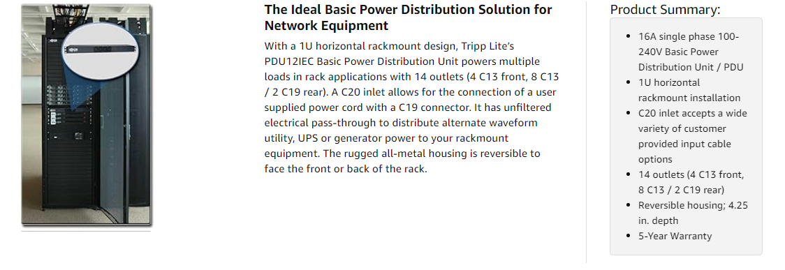 The PDU12IEC comes backed by a 5-Year Warranty and is manufactured in compliance with strict RoHS specifications, reflecting Tripp Lite's commitment to environmental responsibility.
