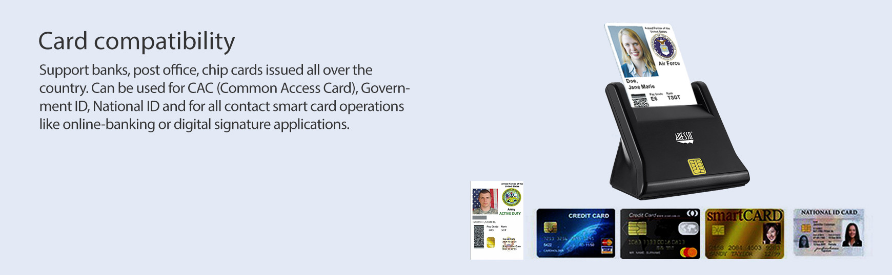 Support banks, post office, chip cards issued all over the country. Can be used for CAC (Common Access Card), Government ID, National ID For all contact smart card operations like online-banking or digital signature applications: ActivClient, AKO, OWA, DKO, JKO, NKO, BOL, GKO, Marinenet, AF Portal, Pure Edge Viewer, ApproveIt, DCO, DTS, LPS, Disa Enterprise Email etc.