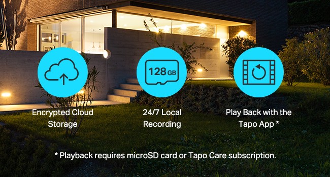 Save continuous footage on up to a 128GB microSD card(card not included) or subscribe to Tapo Care which saves 30-day video history and provides additional benefits such as manual clip recording, video sharing, and automatic clip saving triggered whenever motion is detected.