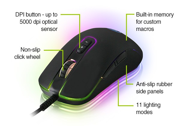 The KORONA RGB Gaming Mouse is an excellent choice for both up-and-coming gamers, as well as experienced enthusiasts that want high performance at a great value. KORONA's gaming-grade optical sensor provides outstanding performance in all FPS, MMO and RTS games. KORONA also features an anti-slip rubber side panels that provide comfortable, non-slip grip, shift-on-the-fly dpi buttons with up to 5000 dpi resolution and built-in memory for storing custom macros when using KORONA's user interface software.