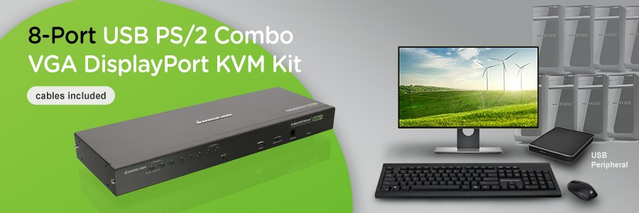 IOGEAR's 8-Port USB PS/2 Combo VGA KVM Kit (GCS1808DPKITU) includes a combo 8-port KVM USB and PS/2 switch that allows you to control and access up to eight (8) USB or PS/2 computers from a single keyboard, mouse and VGA monitor console. The Kit includes a complete set of USB KVM cables and DisplayPort to VGA adapters(support DP ver 1.1a) to ease your installation process.