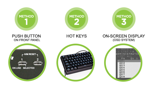 Switching between computers is quickly accomplished by pressing the front panel pushbutton, entering hotkey combinations from the keyboard, or via a menu driven, multilingual On-Screen Display (OSD) system. The switch also includes a convenient auto-scan feature which permits automatic scanning and monitoring of activities on all connected computers.