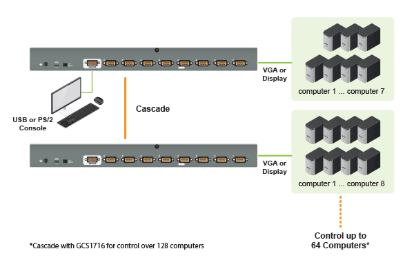 Expand the number of computers you can connect to and control through a single set of peripherals. Cascade and control as many as eight (8) additional IOGEAR 8-Port USB PS/2 Combo VGA KVMP Switch (GCS1808) switches for a total of 64 connected computers, all controlled from a single keyboard-monitor-mouse console. Need to control more computers? Cascade the IOGEAR 16-Port USB PS/2 Combo KVM Switch (GCS1716) to control up to 128 VGA and DisplayPort computers.