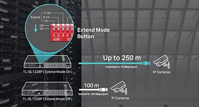 With extend mode, the PoE transmission distance reaches up to 250 m—perfect for IP camera deployment in large areas.