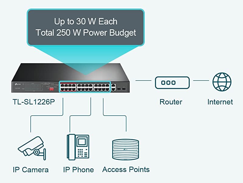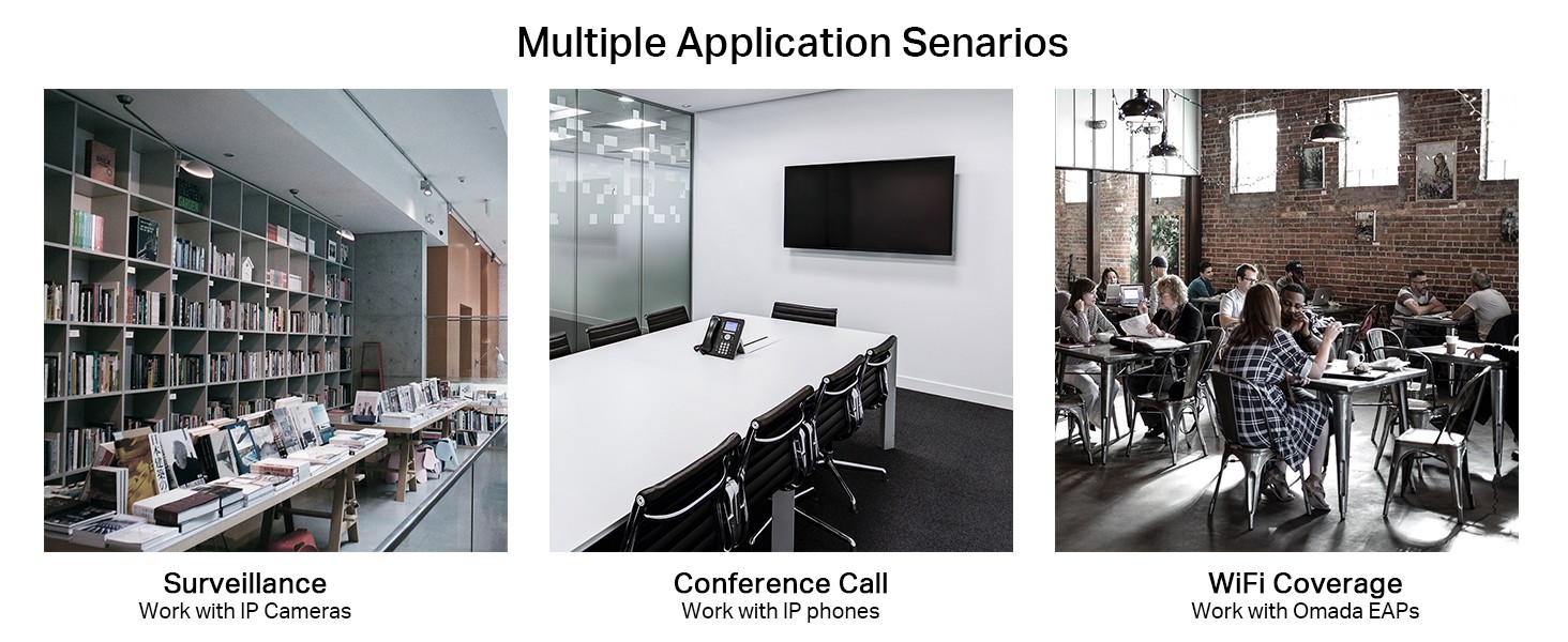 Compliance with the 802.3af/at PoE+ standard supports up to 30 W on each PoE port. The total 250 W PoE power budget for the 24× PoE ports ensures it has wide range of applications, such as surveillance, offices, dormitories, and small businesses. It is fully compatible with IP cameras, access points, IP phones, computers, printers, and more.