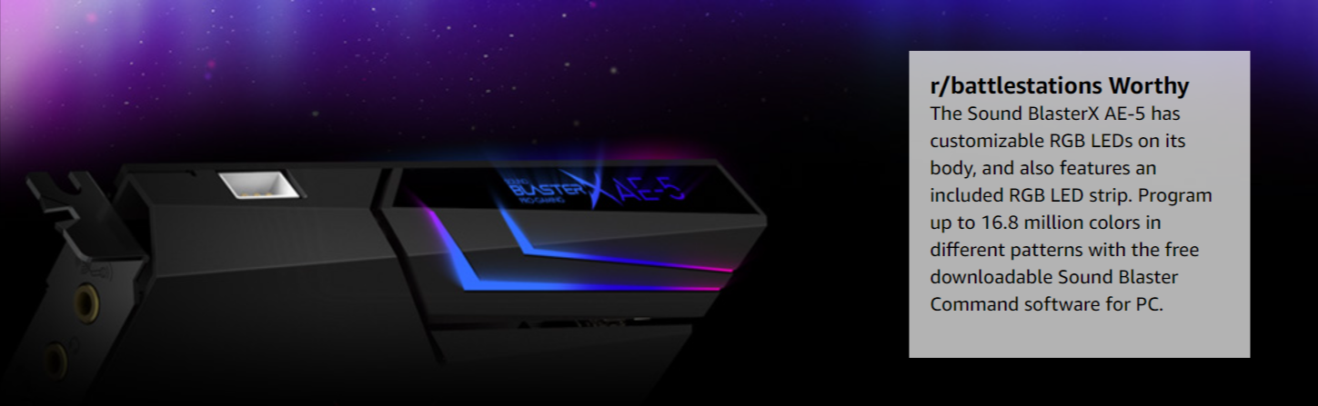 Be one of the proud OPs showing off their gaming rigs on r/battlestations! The Sound BlasterX AE-5 Plus is a perfect convergence between aesthetics and performance that features a SABRE32 ultra-class hi-res PCI-e gaming sound card and DAC with customizable RGB LEDs on its body, and comes with an included RGB LED strip. It also features our award-winning Xamp discrete headphone amp that utilizes a bi-amplification technology, as well as our full suite of industry-leading audio processing technologies including Surround Virtualization.