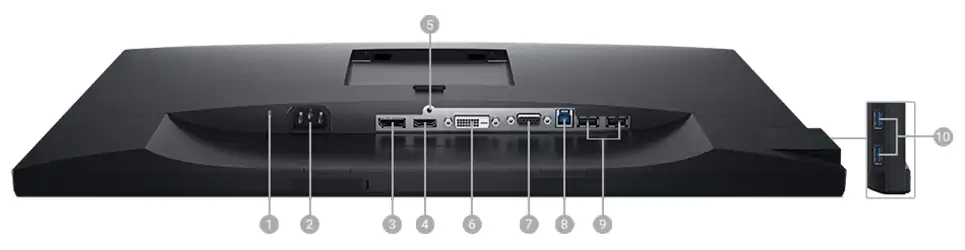 1. Security lock slot | 2. Power connector | 3. DisplayPort | 4. HDMI port | 5. Stand lock feature | 6. DVI port | 7. VGA connector | 8. USB 3.0 upstream port | 9. USB 2.0 downstream port (2) | 10. USB 3.0 downstream ports (2)