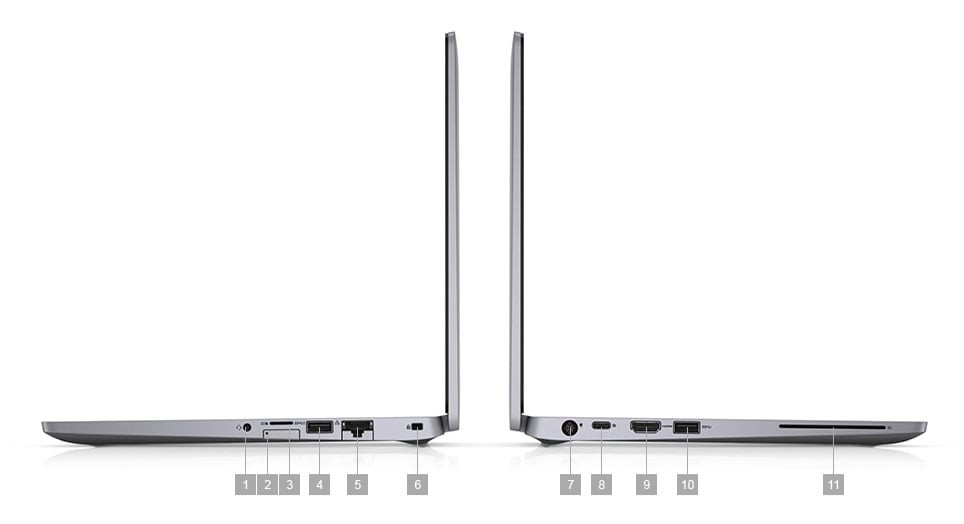 1. Universal Audio Jack | 2. External uSIM Card Tray (optional) | 3. uSD Reader | 4. USB 3.2 Gen 1 with Powershare | 5. RJ45 | 6. Wedge-shaped Lock Slot | 7. DC-in 7.4mm Barrel | 8. USB Type C™ 3.2 Gen 2 with Power Delivery & DisplayPort (Optional Thunderbolt™3) | 9. HDMI 1.4 | 10. USB 3.2 Gen 1 | 11. Smart Card Reader (optional)