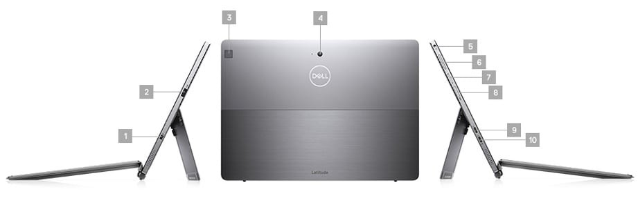 1. Wedge-shaped Lock Slot | 2. USB 3.2 Gen 1 (with PowerShare, USB Type-A) | 3. Fingerprint Reader (optional) | 4. Rear Camera | 5. Universal Audio jack | 6. Volume control | 7. External nanoSIM Card Tray (optional) | 8. uSD 4.0 Memory Card Reader | 9. Thunderbolt™3 with Power Delivery and DisplayPort (USB Type-C™) | 10. Thunderbolt™3 with Power Delivery and DisplayPort (USB Type-C™)