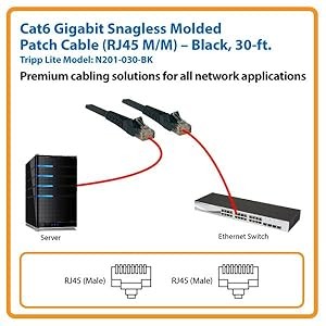 For peace of mind, this 30-ft. Tripp Lite Cat6 Gigabit Snagless Molded Patch Cable comes backed by a lifetime warranty. The N201-030-BK is manufactured in compliance with strict RoHS specifications, reflecting Tripp Lite’s commitment to environmental responsibility.