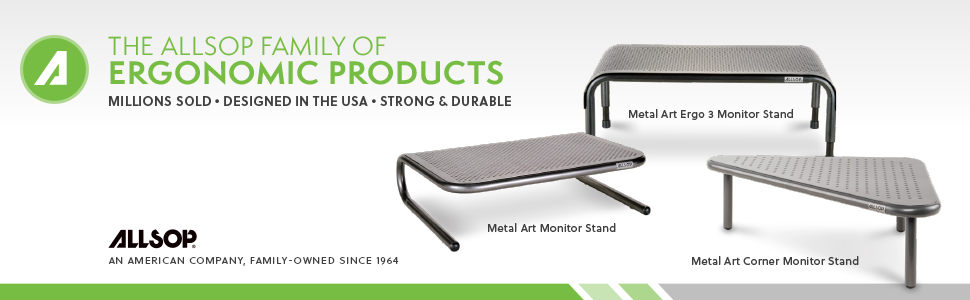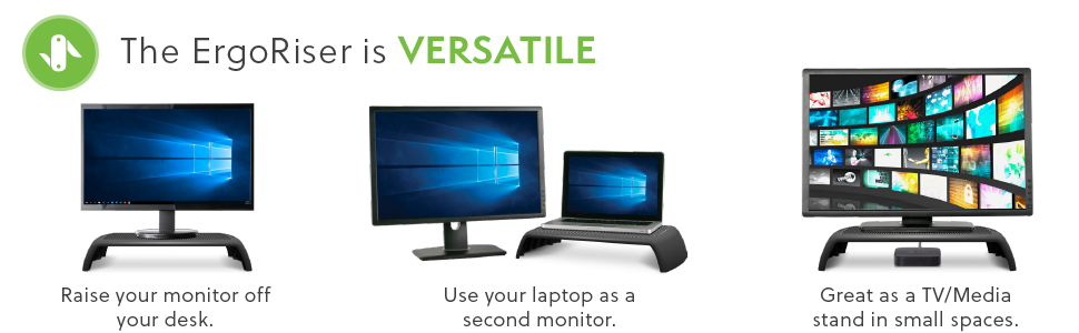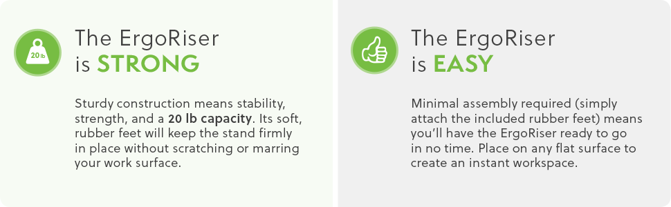 The most affordable and attractive Made in the USA monitor stand offered today, the ErgoRiser Monitor Stand™ raises your monitor or laptop 2.75” to a comfortable ergonomic viewing height. This small and compact stand can support up to 20lbs and features a sleek micro-texture finish that complements any office. The ErgoRiser also creates extra storage under the monitor for a compact keyboard, tablet, or extra office supplies. Non-skid protective feet prevent sliding and protect your desk surface.