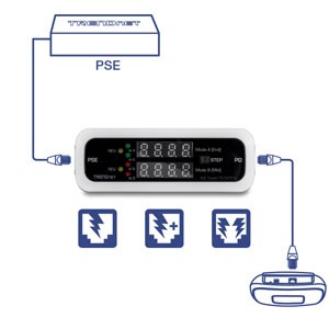 Convenient front-panel 4-digit seven-segment LED display on the PoE cable tester cycles between voltage, wattage, and amperage readings
