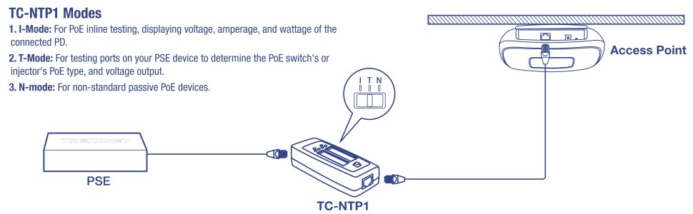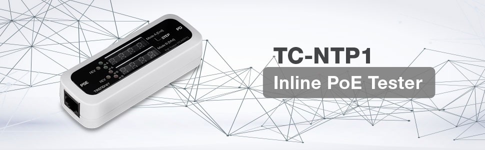 TRENDnet's Inline PoE Tester, model TC-NTP1, is a comprehensive PoE cable tester for network professionals. This compact tool accurately tests PoE++, PoE+, PoE, and passive PoE technologies. The TC-NTP1 PoE cable tester works on active connections, and is designed to sit inline between the PoE source and PoE device. The PoE cable tester then displays real-time PoE information such as wattage, voltage, and amperage for that connection.