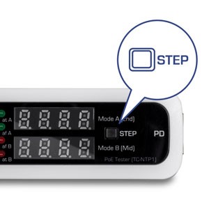 The convenient step button on the PoE cable tester allows users to cycle through voltage, amperage, and wattage readouts. It also allows users to lock the display to a specific readout (e.g. wattage) for real-time monitoring