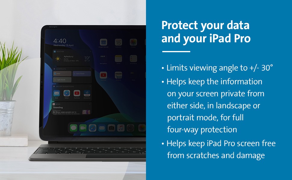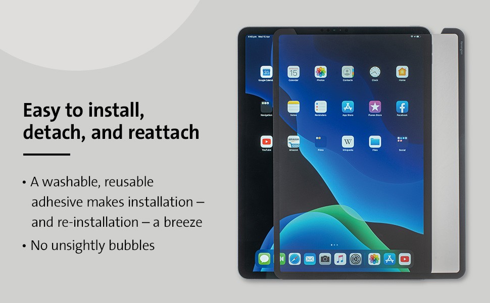The SA11 Privacy Screen for iPad Pro 11” helps protect your privacy, simply and easily. A washable, reusable adhesive makes installation — and re-installation — a breeze, with no unsightly bubbles. Protects privacy by limiting viewing angle to +/- 30° in landscape and portrait mode for full four-way protection. Reduces harmful blue light by up to 22%, diminishes glare, improves clarity, and protects from scratches and damage. Includes a cleaning cloth and acrylic storage solution to help keep it lint and dust free when not in use.