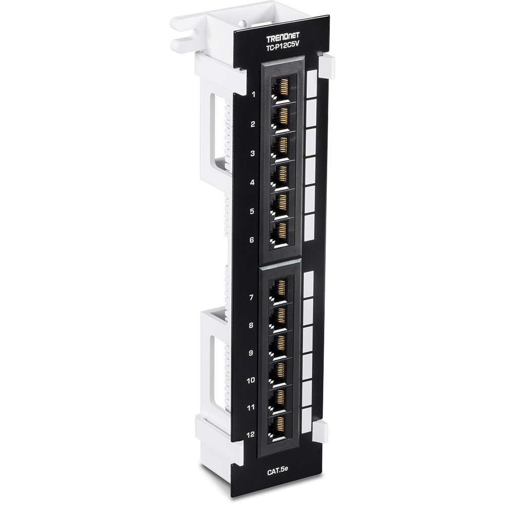 The 12-port patch panel features a blank writing surface above each port, allowing users to label and organize the respective connections.
