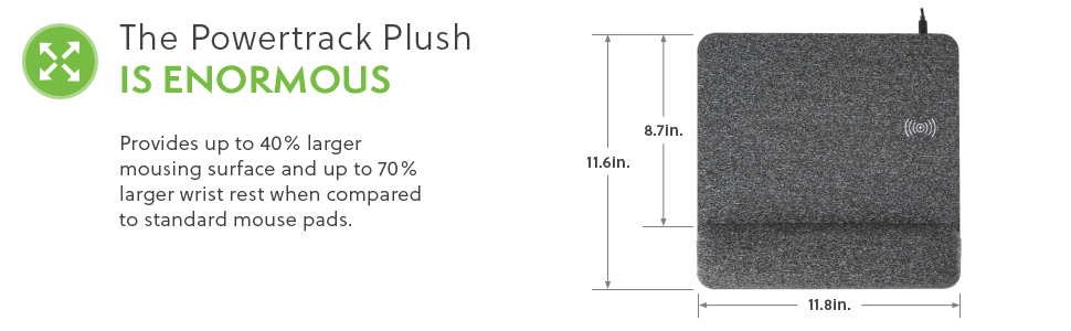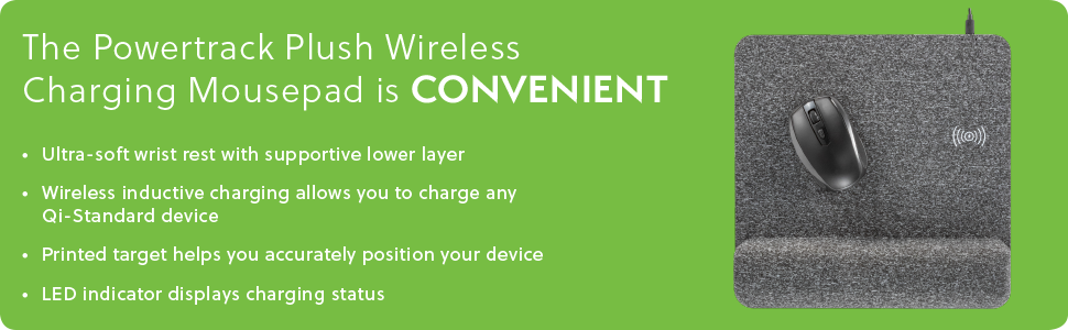 The PowerTrack Plush Wireless Mousepad provides ultra-soft comfort to your wrist and forearm while offering an easy and convenient way to charge your wireless devices.