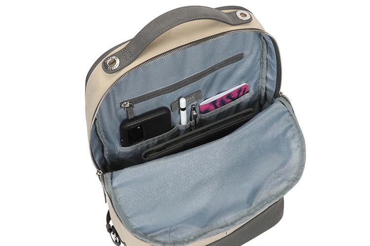 A cradle for your laptop or tablet keeps your device snug in your pack. And on top of the easily accessible two front zippered pockets, the Newport Backpack includes a hidden back panel pocket to safekeep important and private articles.