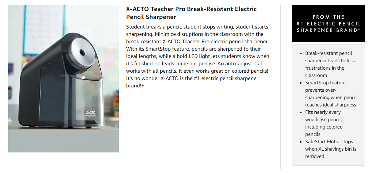 Break-Resistant SharpenerWith the SmartStop feature that sharpens woodcase pencils to their ideal sharpness, the Teacher Pro makes lead break resistant. A LED light even tells students when sharpening is done. |