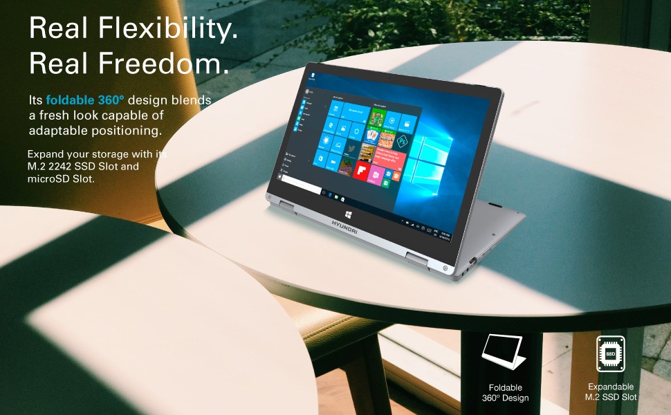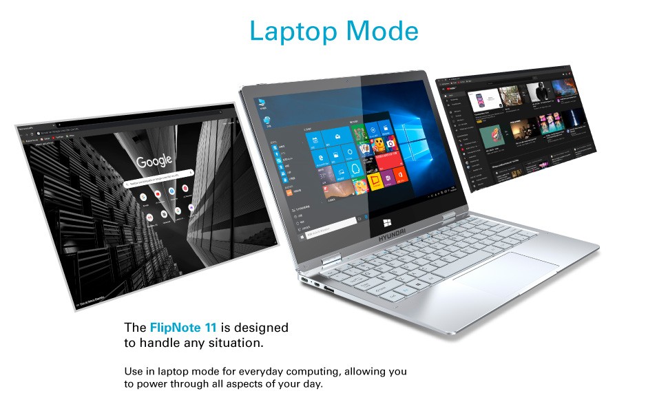 Combining heavyweight performance with lightweight portability, the Hyundai FlipNote 11 possesses an Intel Celeron processor enabling high-speed connectivity and ultra-responsive multi-tasking performance in a sleek package. This 2-in-1 convertible laptop is all about the details — a foldable 360° design, security fingerprint sensor and its ultra-responsive FHD touch screen display. The Hyundai FlipNote 11 is packed with speed and power to amplify your productivity. Expand your storage capacity with its m.2 SSD slot and microSD slot. Faster boot-ups and smoother transitions when you flip from laptop mode into tablet and back. This FlipNote 11 allows you to work and play in style. Backed by a limited 1-year warranty, every Hyundai product is built with absolute quality and precision.