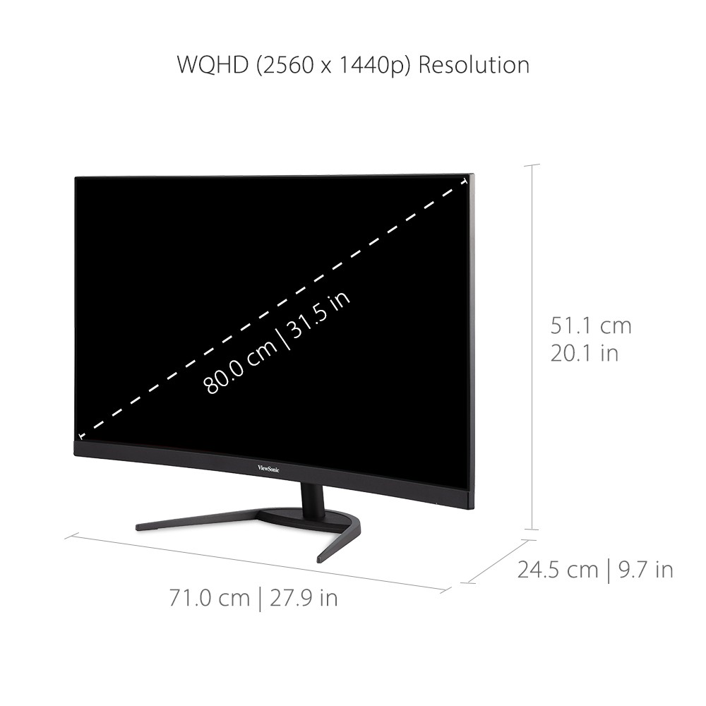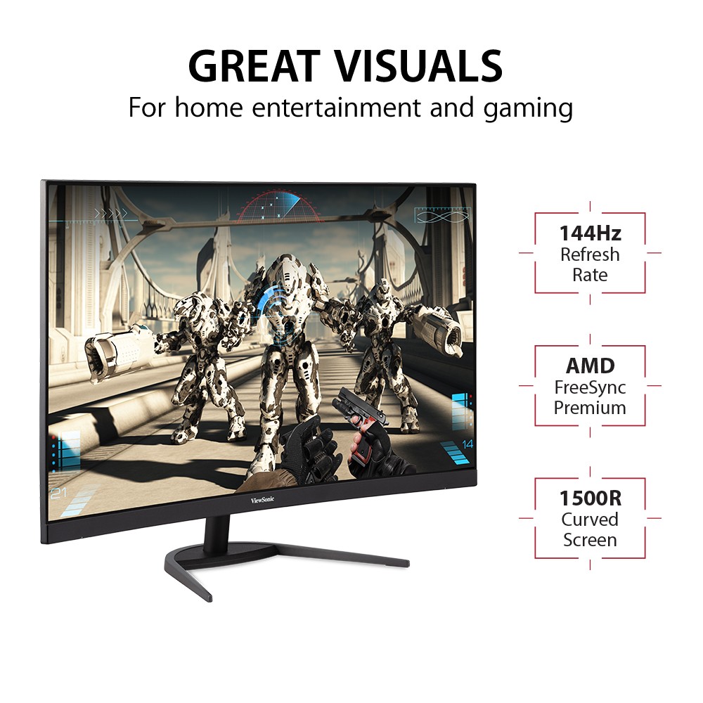 With an immersive 1500R curved screen and stunning WQHD 2560 x 1440 resolution, the ViewSonic ® VX3268-2KPC-MHD monitor provides an incredible viewing experience for work or play. With features including a high 144Hz refresh rate, 1ms (MPRT) response time and AMD FreeSync Premium technology, this monitor virtually eliminates screen tearing and stuttering for a fluid gaming experience. The VX3268-2KPC-MHD also comes equipped with ViewSonic exclusive ViewMode™ presets, which offer optimized screen performance for different home entertainment applications such as watching movies, editing files, or playing video games. Two HDMI (v2.0) inputs, and one DisplayPort (v1.2) input offers flexible connectivity for both general use and entertainment.