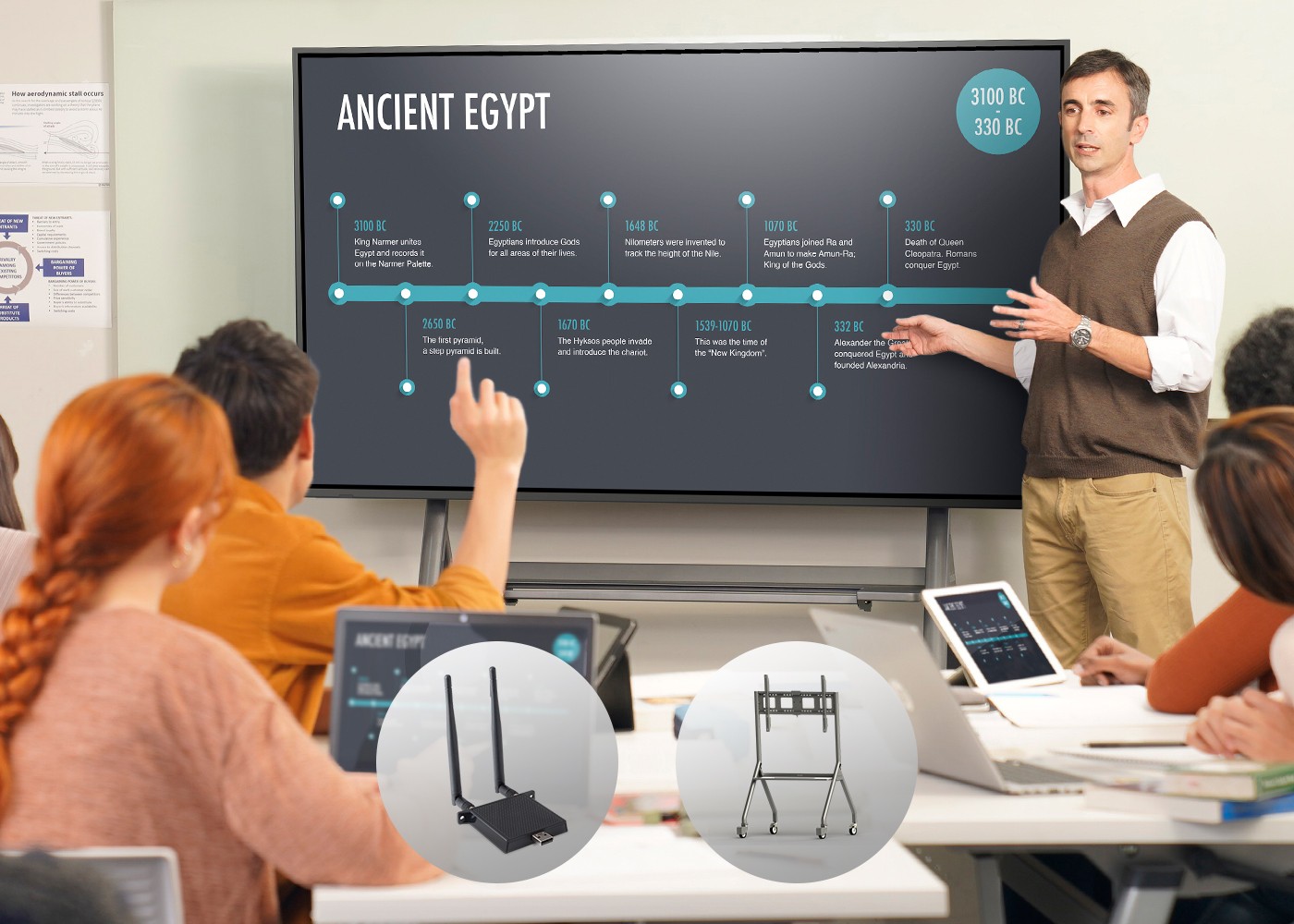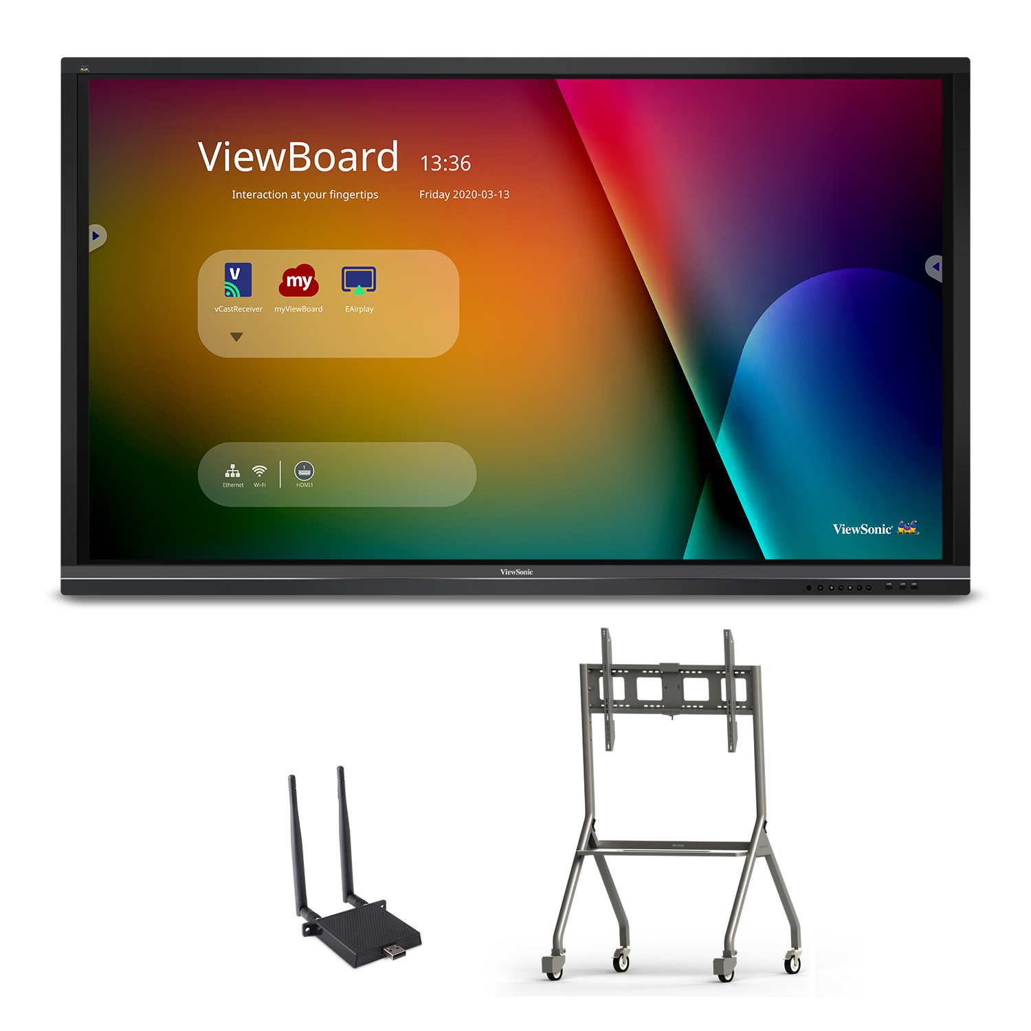 Perfect for education environments, this ViewBoard bundle delivers the most useful items classrooms need to get up and running with their ViewBoard display. You can quickly install the ViewBoard display with the included slim trolley cart, while the included plug-in module provides fast wireless internet connection.