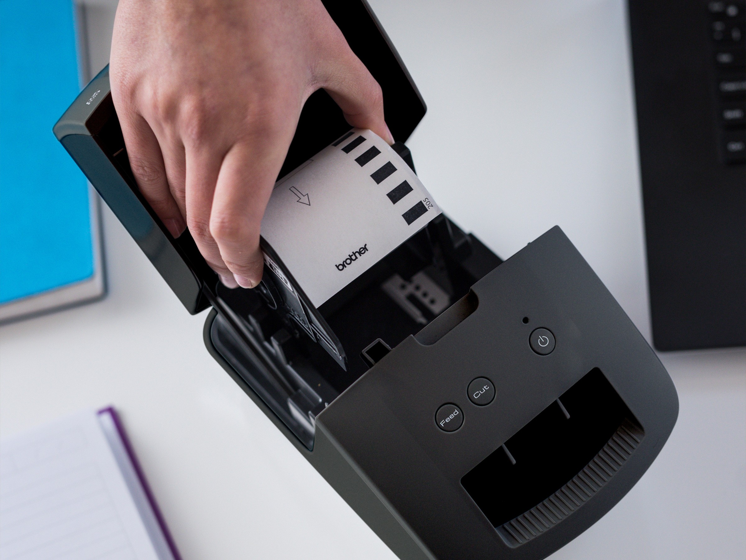 Brother DK rolls are supplied on a unique, easy-loading spool. Simply drop in the spool and feed the labels through the front to print labels in a matter of seconds.
