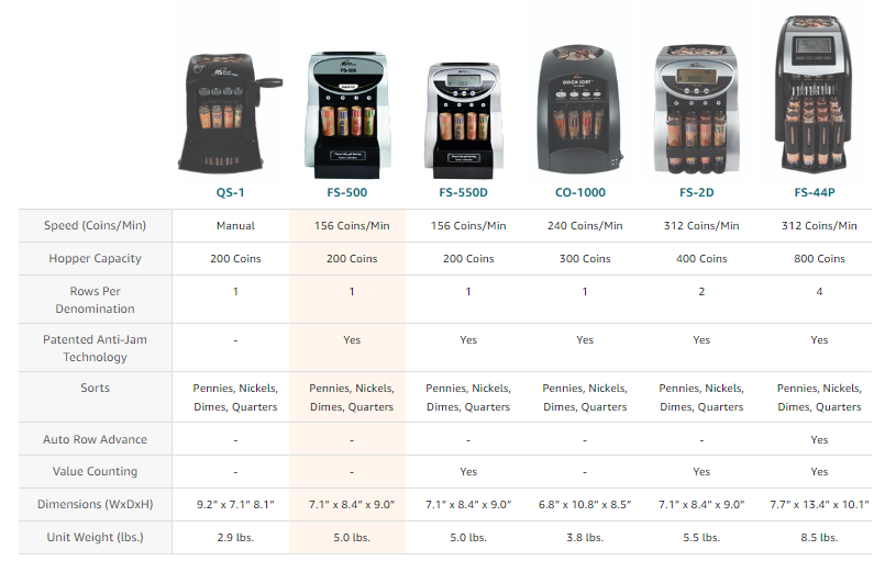 Counting and sorting by hand can be tedious. The FS-500 sorts up to 156 coins per minute. Place the coins into the large hopper and watch the coins rapidly sort into their respective tubes. The FS-500 is a must-have for consumers looking to save time and frustration from counting by hand.