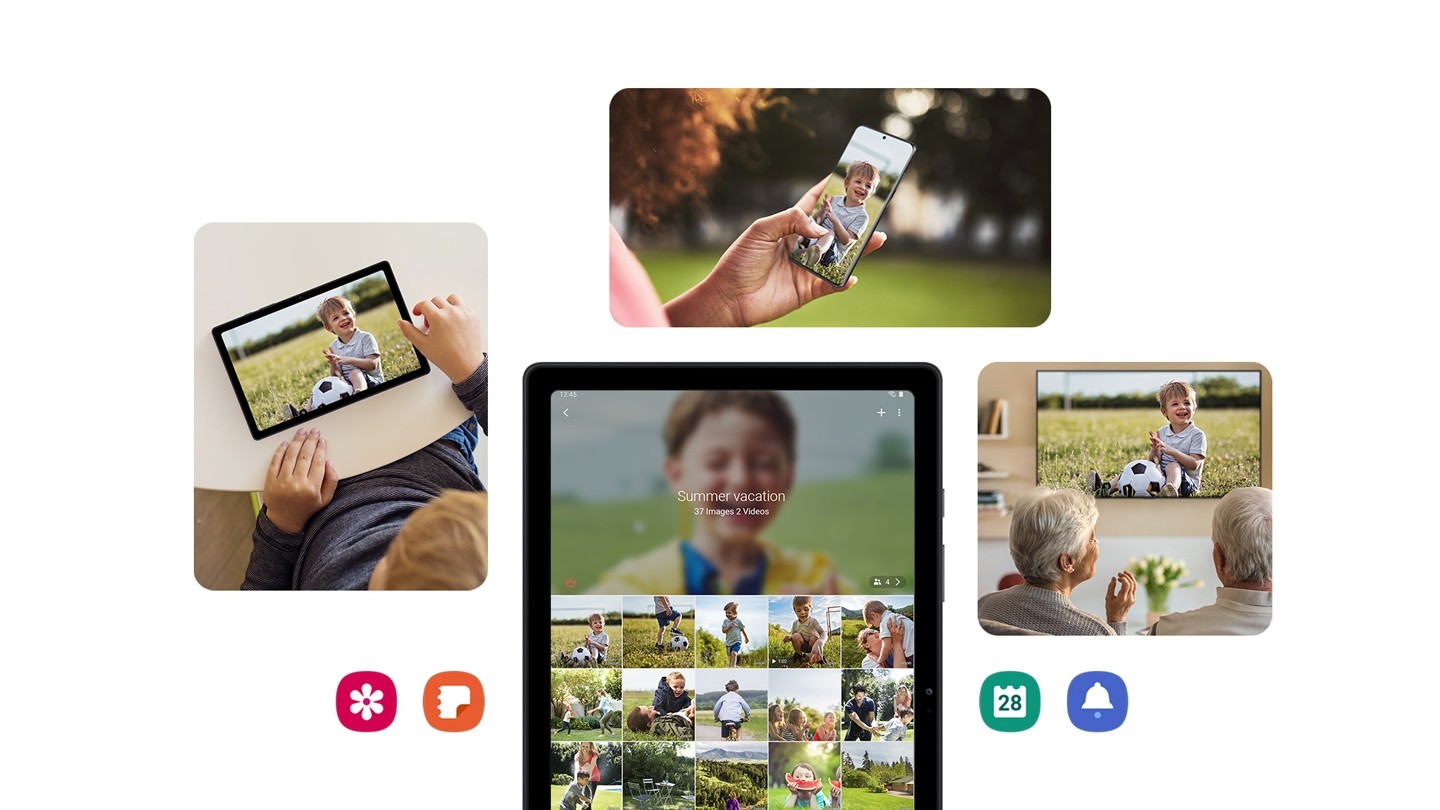 Sharing content can be fast and simple. Galaxy Tab A7 has the option to connect to family members’ devices so you can easily exchange photos, reminders, notes and calendar events.