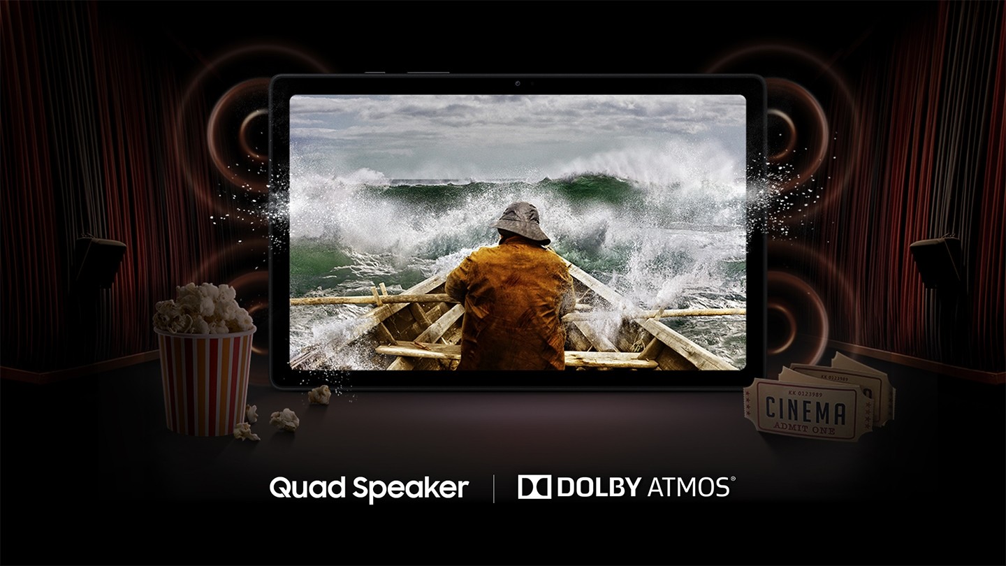 Galaxy Tab A7’s enhanced quad speaker system fills your room with Dolby Atmos surround sound, putting you in the center of the action during your favorite music, movies and shows.
