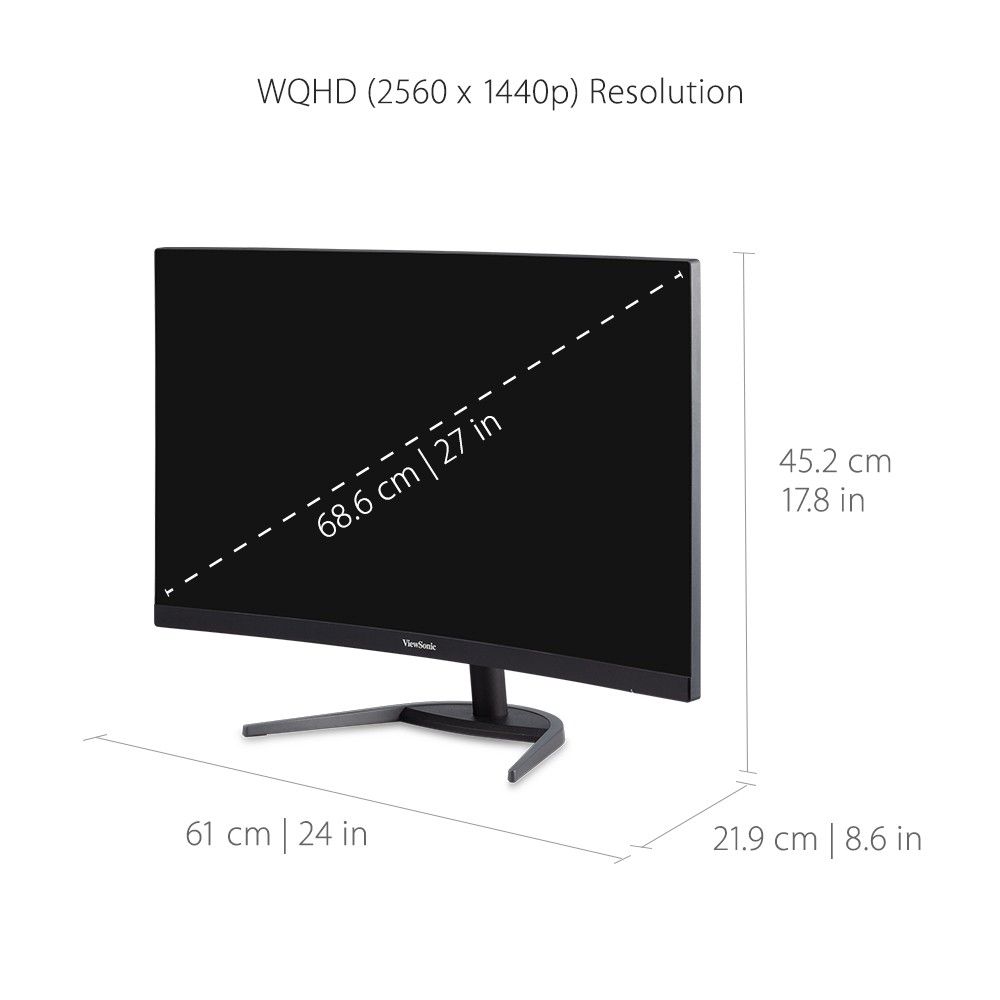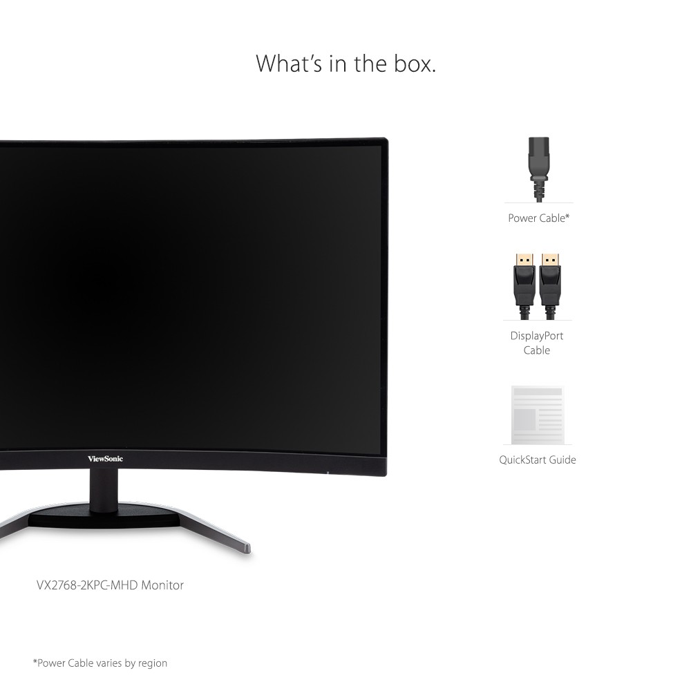 With an immersive 1500R curved screen and stunning WQHD 2560 x 1440 resolution, the ViewSonic ® VX2768-2KPC-MHD monitor provides an incredible viewing experience for work or play. With features including a high 144Hz refresh rate, 1ms (MPRT) repsonse time and AMD FreeSync Premium technology, this monitor virtually eliminates screen tearing and stuttering for a fluid gaming experience. The VX2768-2KPC-MHD also comes equipped with ViewSonic exclusive ViewMode™ presets, which offer optimized screen performance for different home entertainment applications such as watching movies, editing files, or playing video games. Two HDMI (v2.0) inputs, and one DisplayPort (v1.2) input offers flexible connectivity for both general use and entertainment.