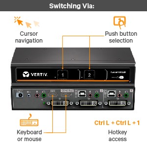 Vertiv Avocent SwitchView Desktop KVM Switches provide control rooms and operations centers with powerful, fast means to access critical applications through multiple computers and functions through a single point of control. Push-button, cursor navigation or hotkey control simplifies switching and provides smooth operations.