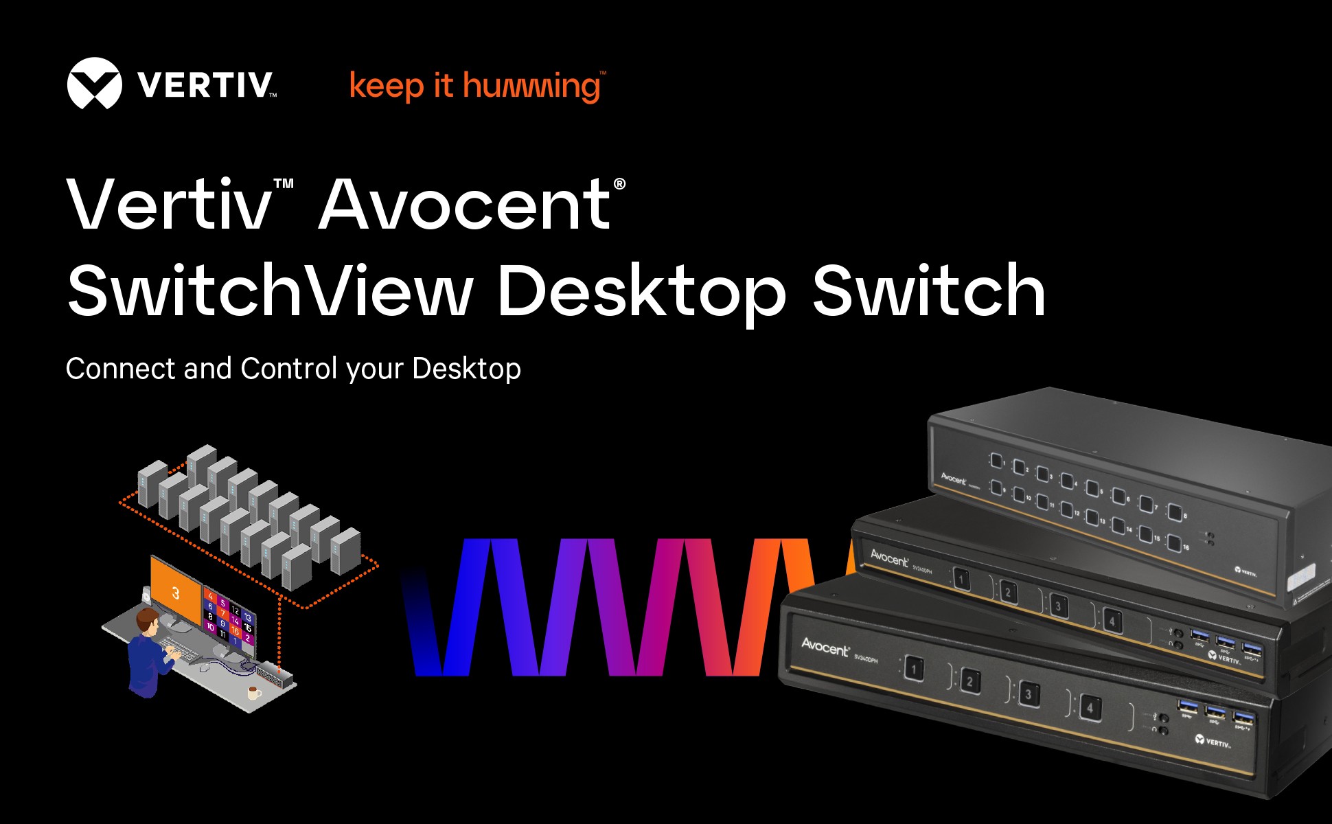 The Vertiv Avocent SwitchView Desktop Switch presents users with the widest array of video connections in the industry, including Display Port, HDMI, and DVI-D connections. Native video support up to UHD 4k @ 60Hz with a flexible screen or window layout option with zero lag.