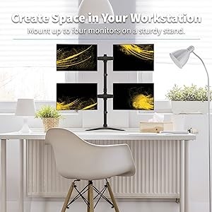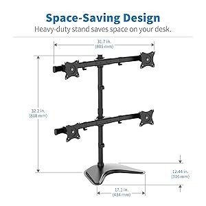 The four monitor mounts feature multiple adjustments, allowing you to reduce glare and find the most comfortable viewing angle. The heavy-duty steel base keeps the stand stable during adjustments.