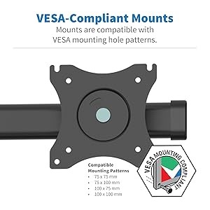 The four mounts support VESA mounting hole patterns for compatibility with most 13- to 27-inch displays. Cable guides along the arms and center pole keep cables neat to maintain a professional look.